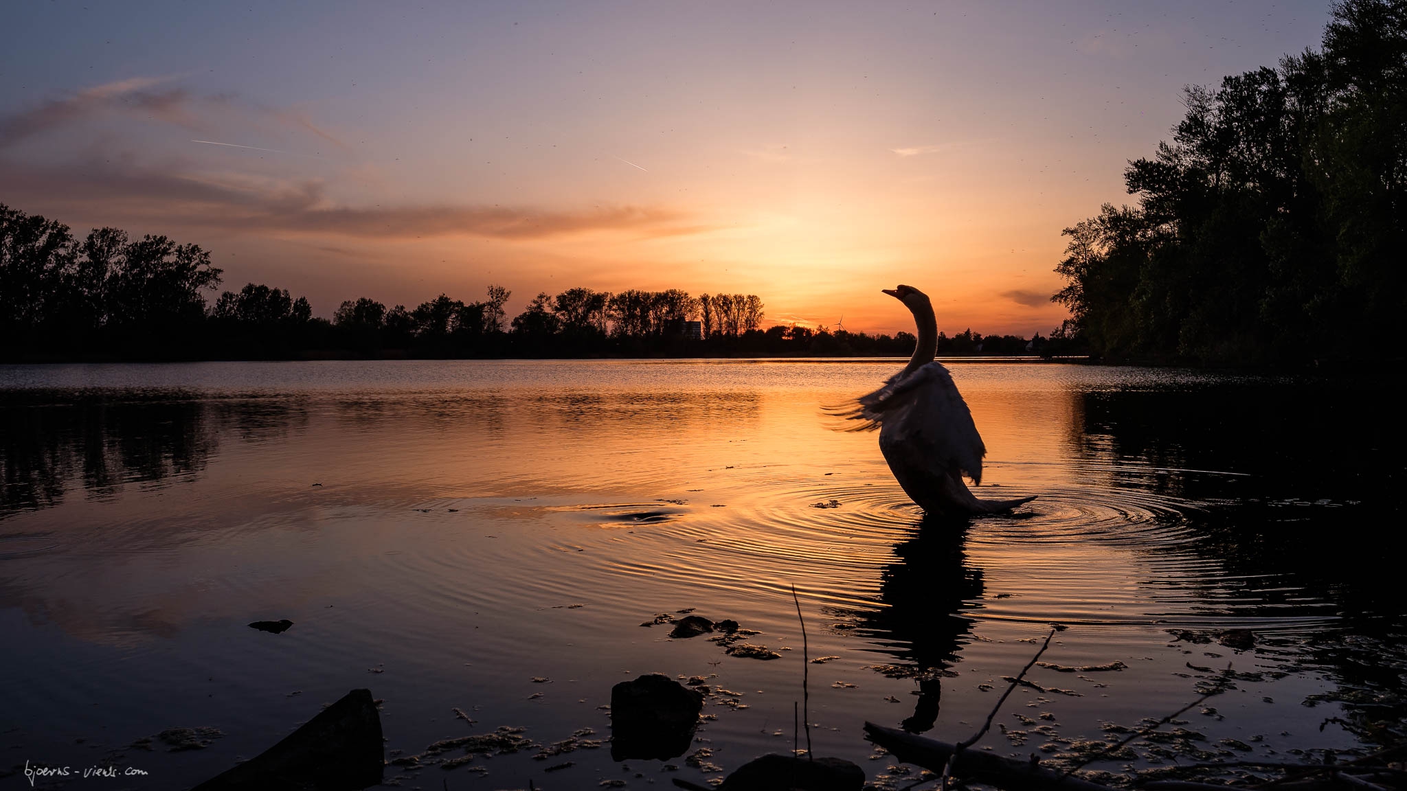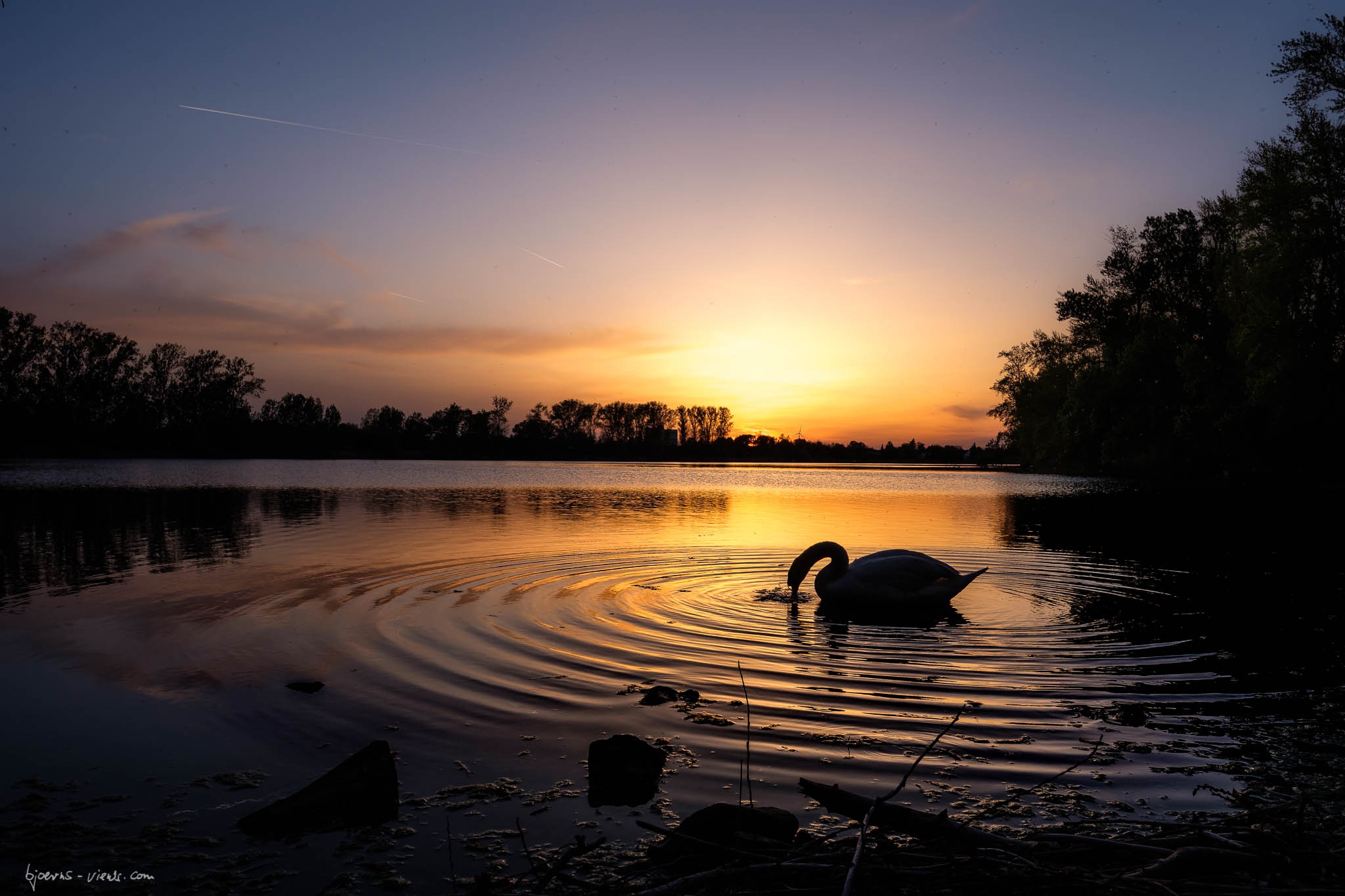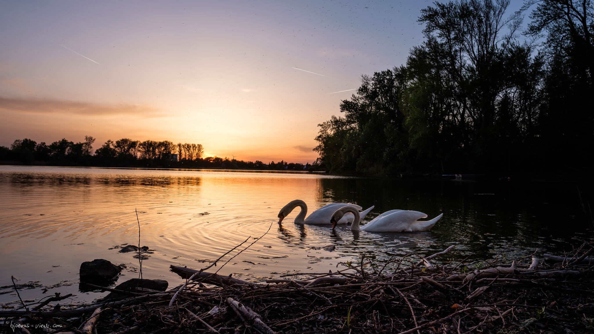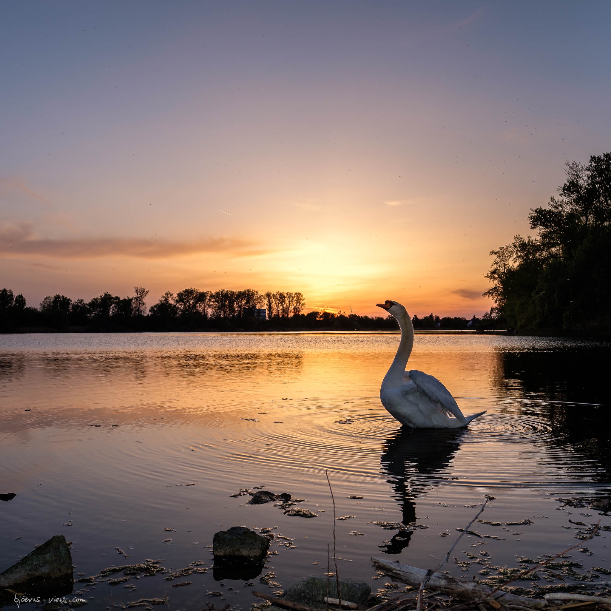 Natürlich hatte ich die Schwäne dort gesehen und gehofft, dass weder ich sie noch sie mich verjagen. 😀 Erst wurde ich etwas unfreundlich angefaucht, aber als ich mich dann klein gemacht und auf den Boden gesetzt hatte, war ich akzeptiert. Dummerweise sind die beiden Schwäne zunächst eher aus meinem Blickfeld geschwommen, aber dann dachte ich, genieße ich den Sonnenuntergang einfach so. Und dann, dann hatten sie doch Erbarmen mit mir armem Fotograf. Sie sind ganz nahe gekommen und haben mir erlaubt ein paar Bilder gegen den Sonnenuntergang-Himmel zu schiessen. Die Beiden haben den Abend gerettet und ich habe ein paar schöne Bilder mit Ihren Posen zum Zeigen. 🙂