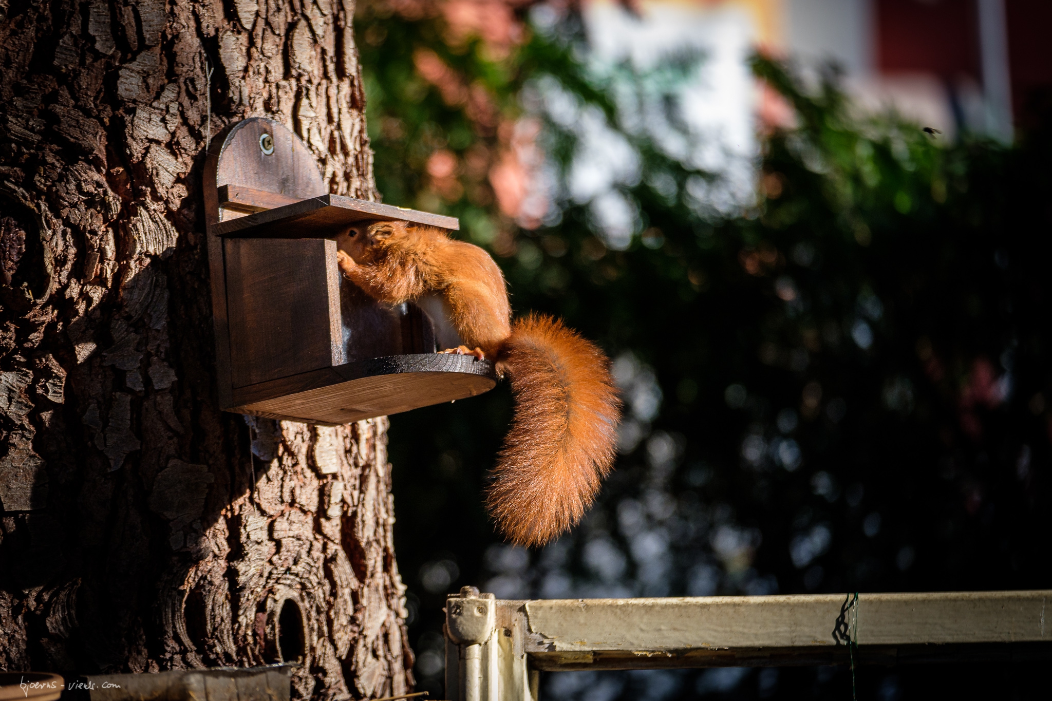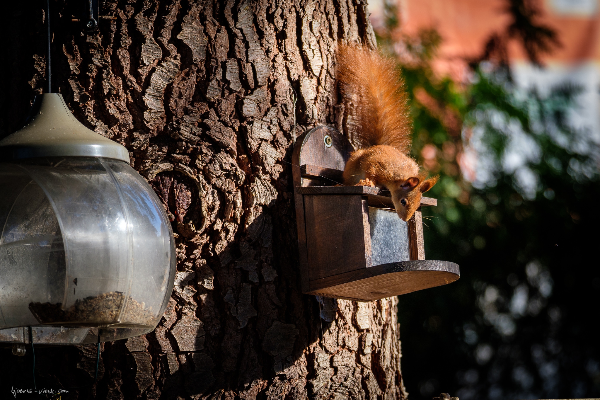 Zu goldige Bilder von den Eichhörnchen hatte ich schon bei Ingrid gesehen. Sie hat das Glück, sie immer mal wieder in ihrem Hof zu sichten. Da musste ich doch einfach mal versuchen, mich selbst einzuladen um die Kleinen auch mal zu beobachten und ein paar schöne Bilder zu machen. Zum Glück hatte Ingrid ein Erbarmen mit mir und wir haben uns früh am Morgen verabredet. Leider wurde gerade an diesem Tag an einem der gegenüberliegenden Häusern unter lautem Palavern, begleitet von Scheppern und Getöse ein Gerüst abgebaut. So haben sich die Eichhörnchen nicht so wohl gefühlt und waren nur wenig zu sehen. Aber für ein paar schöne Bilder hat es gereicht.