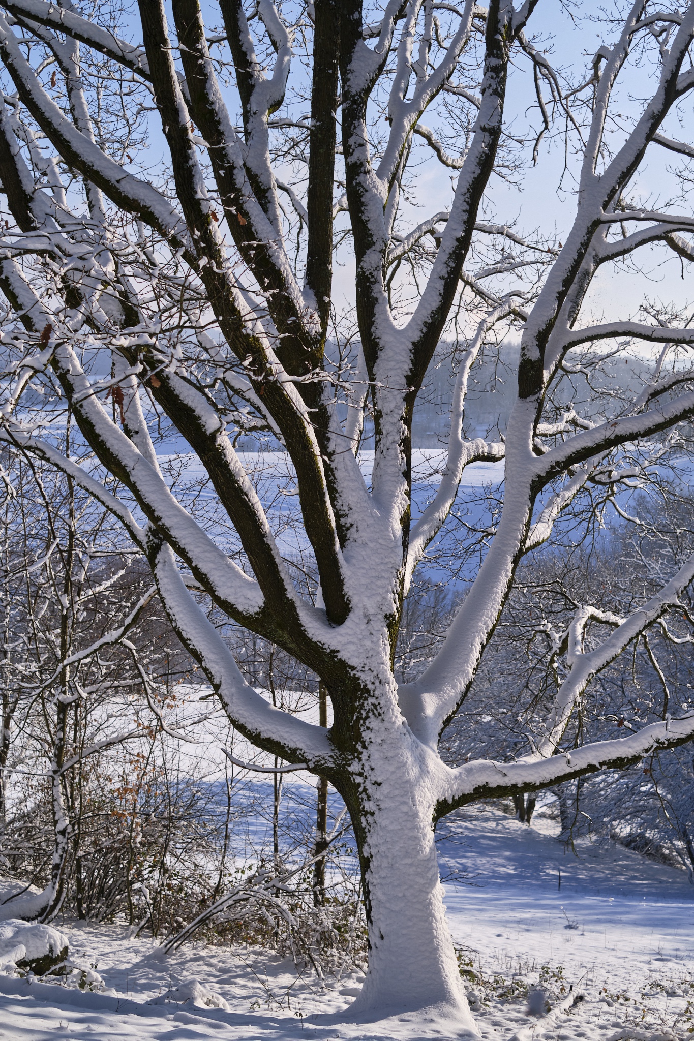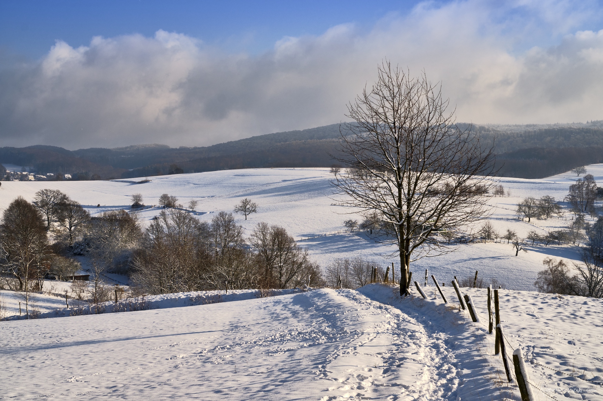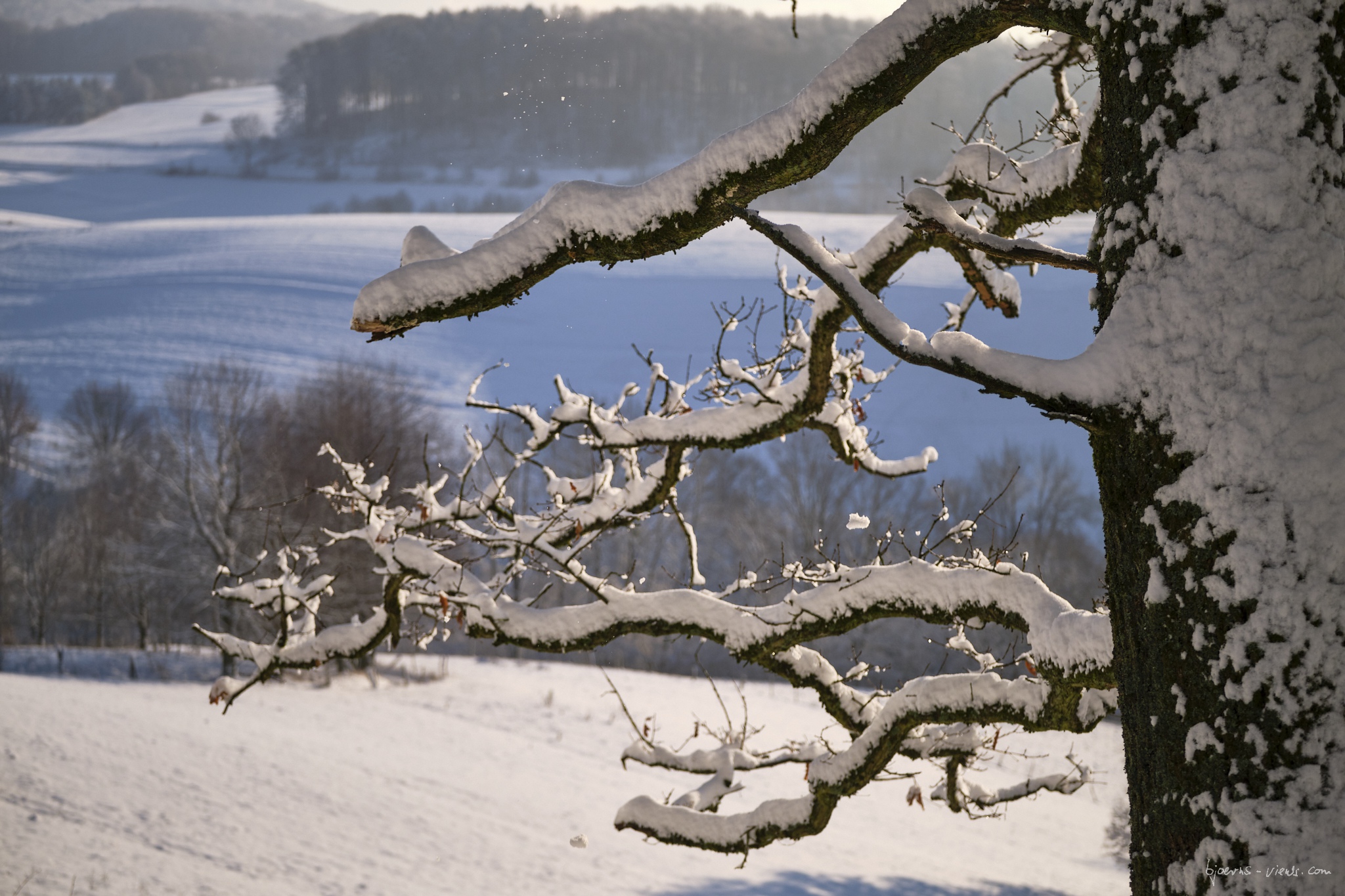 Und dann war ich eigentlich schon auf dem Heimweg, kam über eine Kuppe. Dort war der Blick so schön, dass ich bei der nächsten Gelegenheit umgedreht habe, weil ich noch ein bisschen durch den Schnee stapfen wollte. Auf meinem Weg hoch, sind dann noch diese Bilder entstanden. Damit kam ich dann wenigstens noch auf meine 10.000 Schritte. 🙂